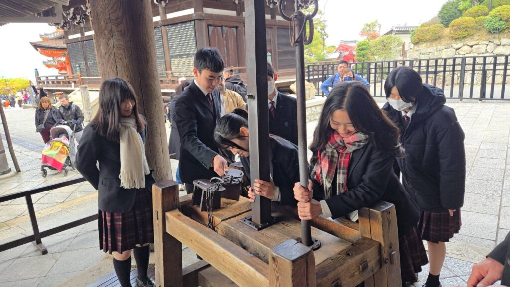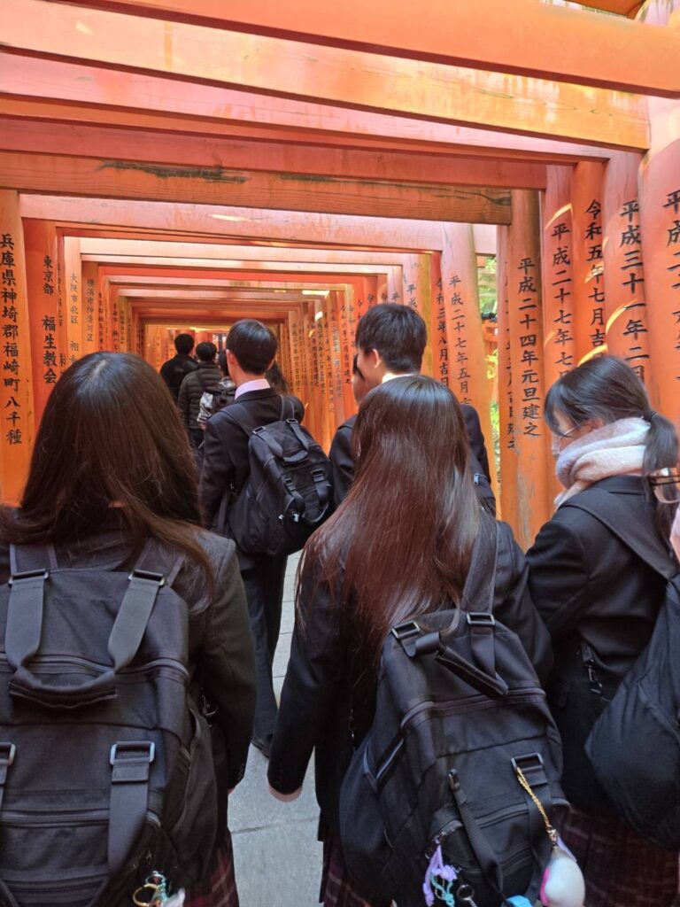 4日目は京都市内で班別自由行動を行いました。班ごとに事前に計画した行程に沿って移動し、清水寺や伏見稲荷大社などをはじめとする名所を巡りました。生徒たちは、それぞれの興味に応じて歴史的建造物や街並みを見学し、京都ならではの文化に触れることができました。自由行動を通して、時間管理や協力の大切さを実感しながら、充実した学びの時間となりました。