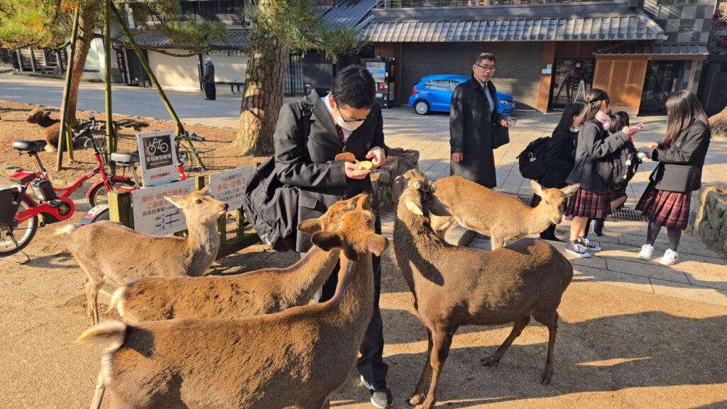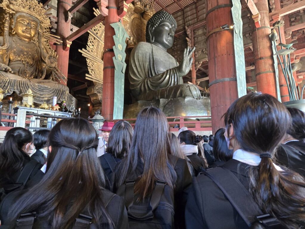 3日目は奈良市内を巡る観光を行いました。特に東大寺では大仏殿の壮大さや歴史的な建築の迫力に、生徒たちは大きな感動を覚えていました。また奈良公園では鹿とのふれ合うこともでき、奈良の自然と文化に触れることができました。