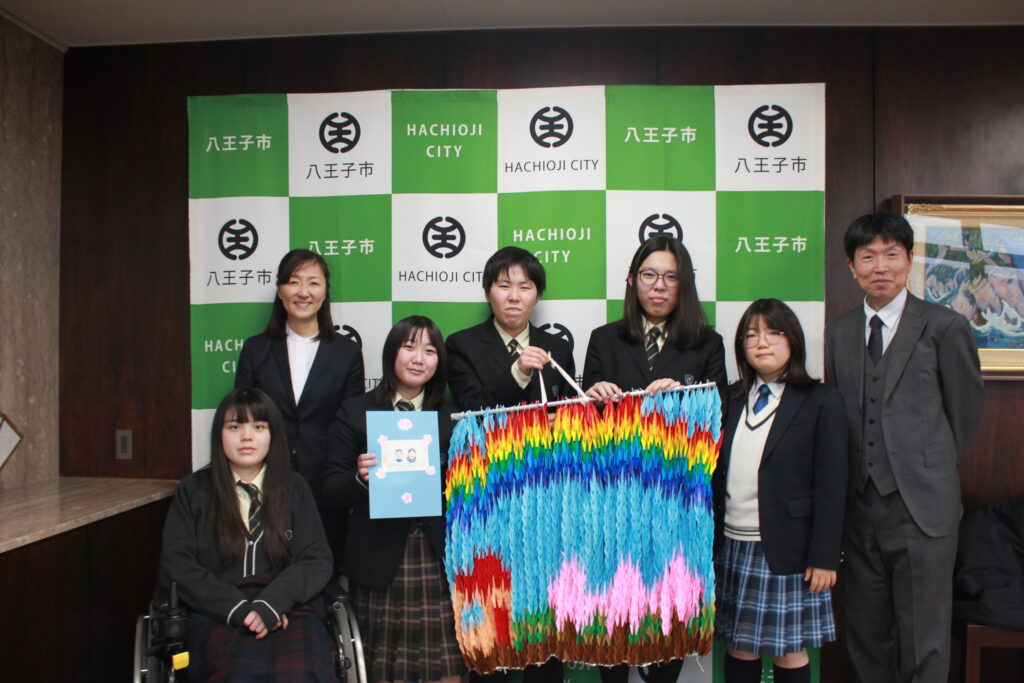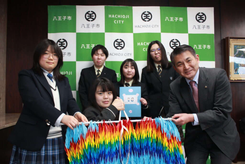 2月12日、ボランティア部代表メンバーが八王子市長を訪問し、ドイツのヴリーツェン市に送る千羽鶴を届けました。